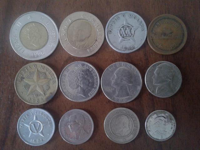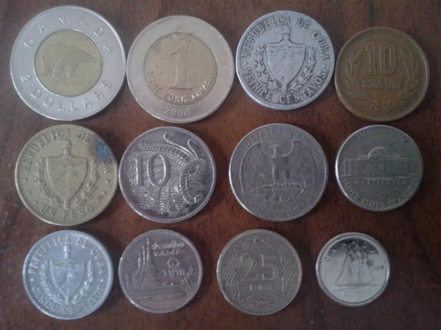 Keletas pasaulio monetu. Amerikos. Kubos. Australijos. Turkijos. Kanados. Kinijos. Tailando.
