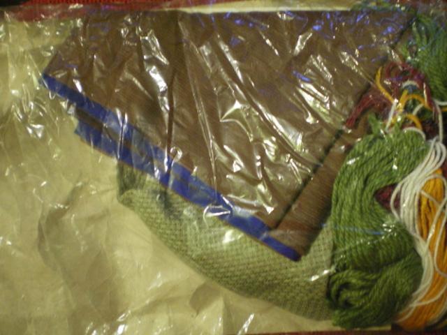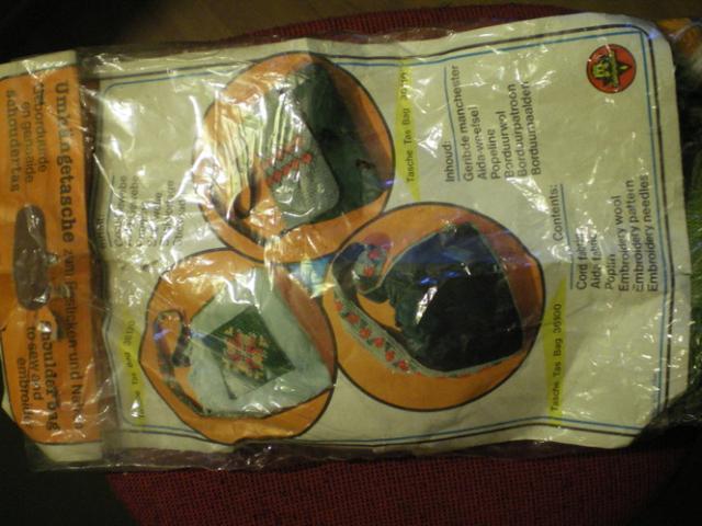 komplektas susidedantis iš velveto rudo, mėlyno pamušalo medžiagos, siūlų, siūvinėjimo siūlų, adatų skirtas pasisiūti ir išsisiuvinėti tašę.