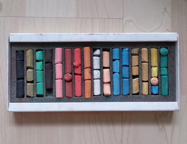 Pastelių rinkinys. Piešta labai mažai, tačiau, benešiojant kuprinėje, sutrupėjo