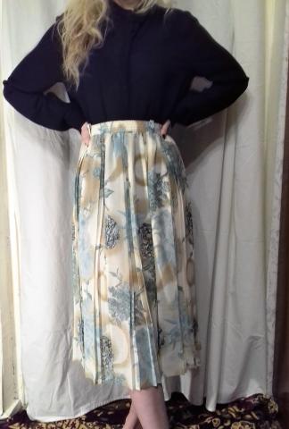 nuostabus švelnių motyvų klostuotas sijonas. pats šviesus, su žydrais ir chaki spalvos elementais. truputį panešiotas pamušalas (pamaniau, jog reiktų paminėti, tad ir būklę pažymiu 'gera'), tačiau tai išorinės sijono kokybės visiškai nekeičia - atrodo puikiai. labai stilingas, vintažinis, tikrai bus išskirtinis rūbelis pavasario garderobe!