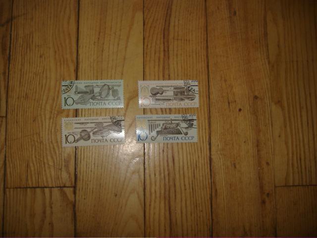 Sovietu sajungos tautu liaudies muzikos instrumentai. Lietuviu, gruzinu, kazachu, azarbaidzanieciu. Antspauduoti.