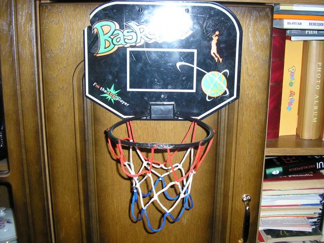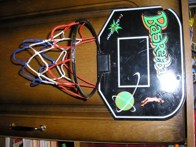 Patogus pakabinamas krepsinis. Galima naudoti tiek kambaryje, tiek lauke. Lenteles dydis 22,5x30cm. Bukle vidutiniska kadangi suluzes kampas, suklijuotas lankas, bet naudoti dar tikrai tinkamas. Kamuoliukas yra. Kaina be kamuoliuko 3eur, su kamuoliuku 5eur.