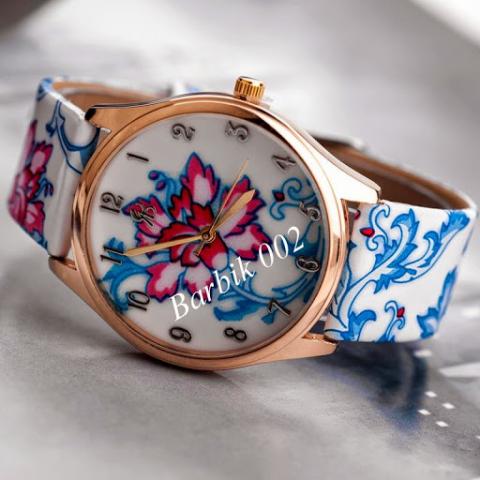 Spalvingas,ryškus odos imitacijos laikrodukas. Laikroduko skersmuo 4,3 cm. apyrankės ilgis 23,9 cm. apyrankės plotis 1,9 cm.