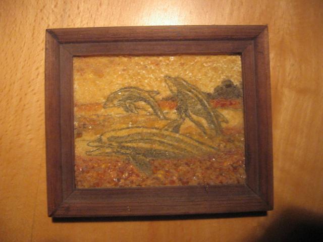 Nedidelio formato paveikslėlis su delfinais. Mielas ir šiltas. Iš gintaro.
