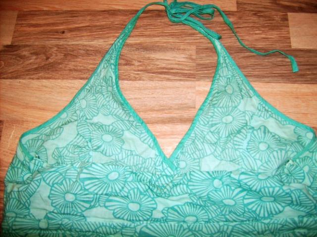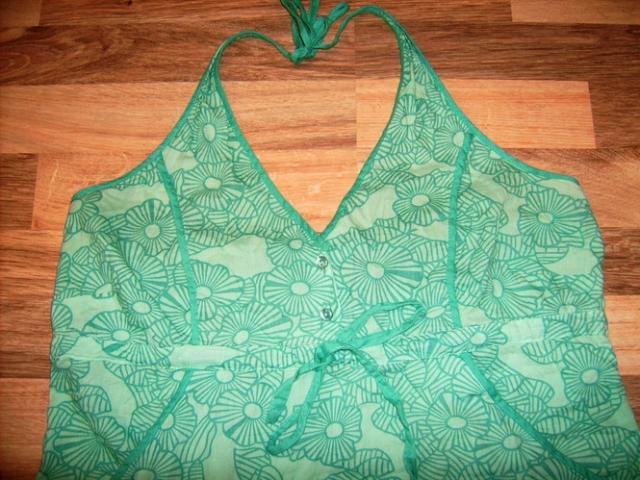 Medvilninė, po krūtine susiriša, graži spalva. Geriau atrodytu toms, kurios turi didesnę krūtinę :] Dydis L