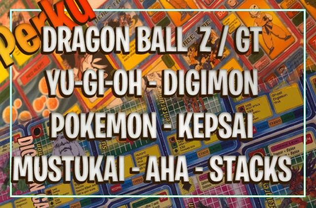 Dragon Ball (Special Edition), Dragon Ball Gt, Yu-Gi-Oh (apvaliais kampais), Yu-Gi-Oh (Tazai), Aha kortos, Digimon, Kepsai ir Muštukai, Staksai, Duel Masters, Lipdukus, Kitu Dbz, Digimon, Yugioh kortų (Nuotraukoje parodyta)