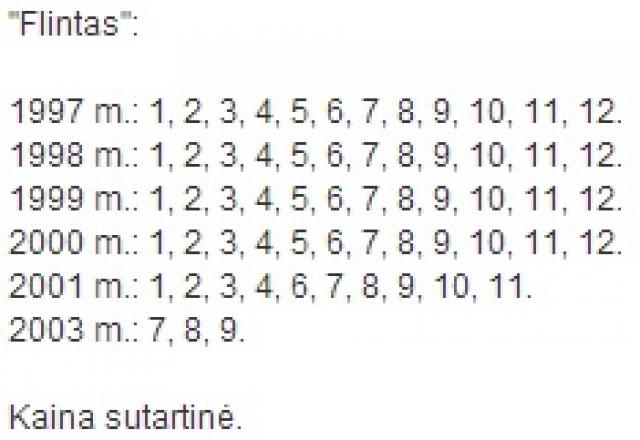 Reikalingi šie numeriai: 1997 m.: 1, 2, 3, 4, 5, 6, 7, 8, 9, 10, 11, 12. 1998 m.: 1, 2, 3, 4, 5, 6, 7, 8, 9, 10, 11, 12. 1999 m.: 1, 2, 3, 4, 5, 6, 7, 8, 9, 10, 11, 12. 2000 m.: 1, 2, 3, 4, 5, 6, 7, 8, 9, 10, 11, 12. 2001 m.: 1, 2, 3, 4, 6, 7, 8, 9, 10, 11. 2003 m.: 7, 8, 9. Kaina sutartinė.