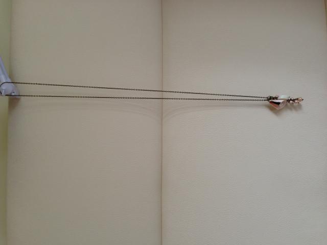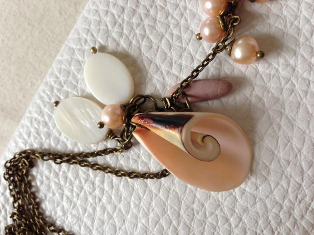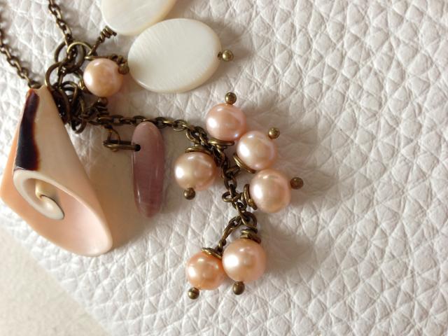 NAUJA *ilgas puošnus rankų darbo kaklo papuošalas; *natūralios medžiagos; *puiki spalvų gama; Sudėtis: persikiniai kultyvuoti perlai(8mm diametras); balto perlamutro karoliukai(13*18mm); rausva kriauklelė(19*23*33mm); rausvas mokaitas(6*17mm); bronzos spalvos vario lydinio grandinėlė(2*440mm);