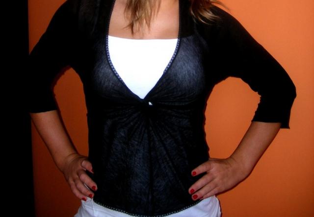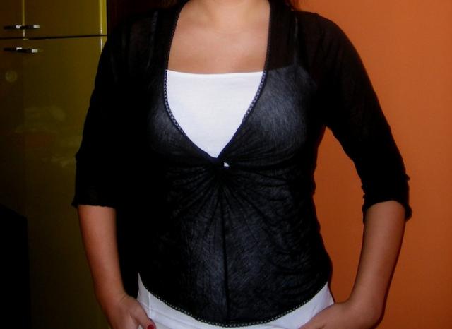 Juoda permatoma bliuskyte,tinka nesioti po apacia maikute trumpom rankovem,arba ne:}