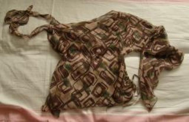 Nuotraukoje nesimato, kad perregima. Viena rankovė. Vietoj kitos rankovės raišteliai kaspinui ar šiaip susirišti.