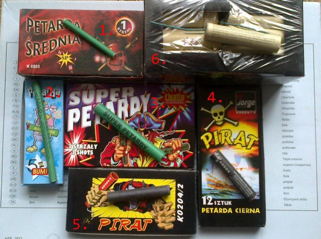 Sarašas ; 1. Petarda Srednia(žalios) , viename pakelyje yra 100vnt viena sprogsta 1karta. - 15Lt 2.Petarda 5x BUM , viename pakelyje yra 10vnt viena sprogta 5kartus. - 5Lt 3.Super Petarda , viename pakelyje yra 12vnt viena sprogta 3kartus. - 15Lt 4.Pirat petarda ciernia , viename pakelyje yra 12vnt viena sprogsta 1karta. - 13Lt 5.Pirat K0204/2 , viename pakelyje yra 12vnt viena sprogsta 1karta. - 13Lt 6. Ipač galingos, viename pakelyje 40vnt viena sprogsta 1karta. - 40Lt