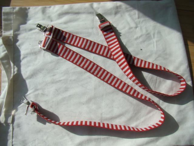 Raudonai baltai dryžuotos petnešos. Nulužęs vienas užsegimas, bet užsisega su antru taip kad viskas laikosi :)