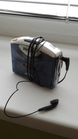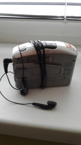Kasetinis nešiojamas ausinukas. Yra radijas. Maitinimas - 2 AA tipo baterijos.