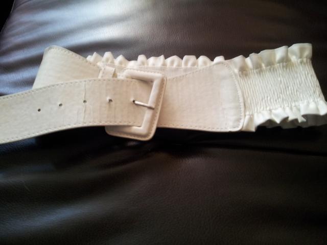 Platus, rauktas pieno spalvos dirzas. Graziai aptempia liemeni. Priekine dirzo dalis ir sagtis tikros odos,vidineje dalyje isiuta guma, todel labai tamprus