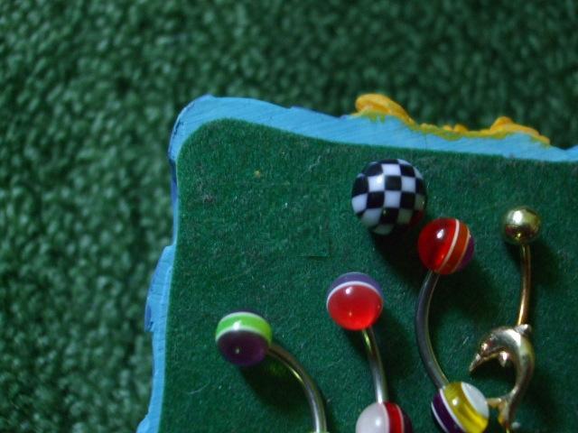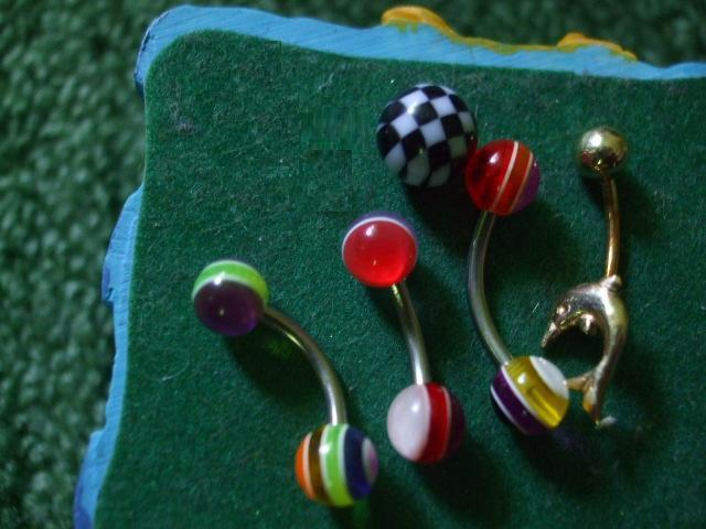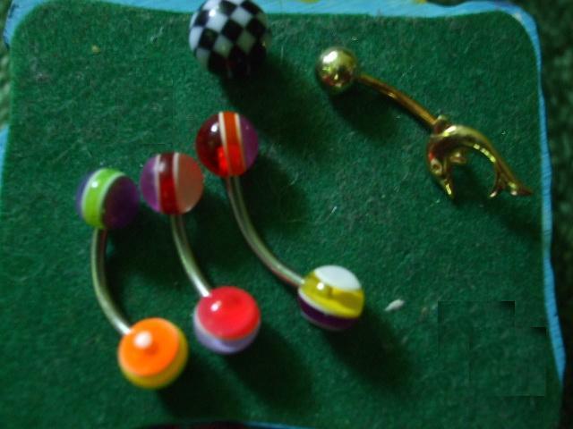 Auskarai visi skirti į bambą, ar antakį (med.plienas, plastikas ir auksas). Auksinis - delfinas iš Egipto berods, brangus atminimas - ne į bet ką. Bumbuliukai spalvoti visi - plastikiniai.