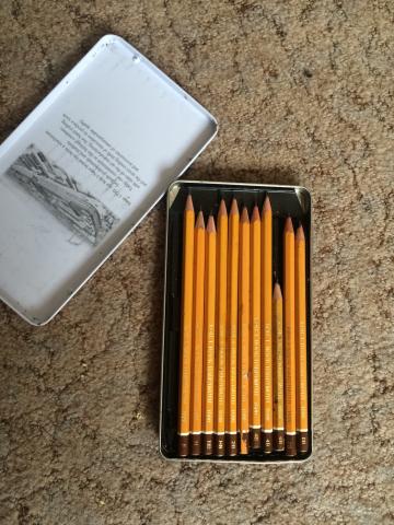 Skirtingų minkštumų pilki pieštukai eskizavimui ar braižybai su dėžute. Vieno trūksta iš rinkinio