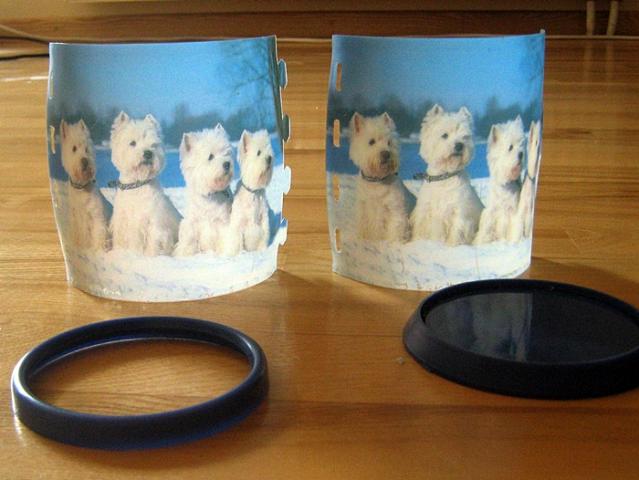 Mėlyna pieštukinė su škotų terjerais. Išsilanksto. Šiek tiek pabraižyta.