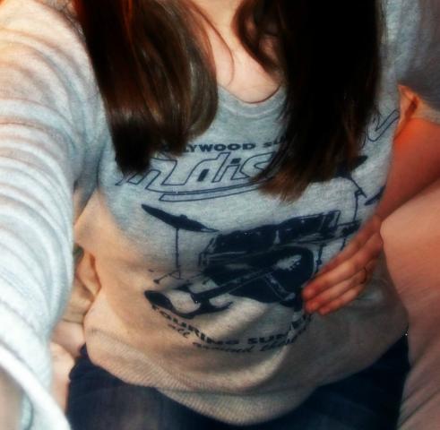 Pilkos spalvos maikutė su nupieštais būgnais. Dėl kainos galima derėtis.