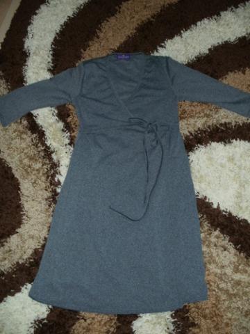 Pilka suknelė, perrišama rašteliais, be jokių defektų, 3/4 rankovėmis. Dydis M/L. Sudėtis: 92 proc. polisteras, 8 proc. elastanas. Kaina - 25 Lt., + p.i.