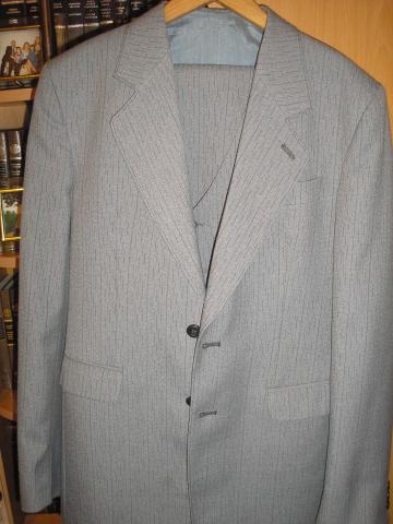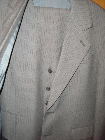 Pilkas kostiumas su juodom juostelėm. Rankovių ilgis - 61 Pečių linija - 50 Kelnių ilgis- 107 Liemuo 84