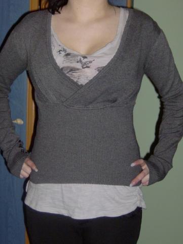 Dydis 38. Megztukas plonas, tinka pavasariui, gražiai išryškina krūtinę,ilgesnės rankovės, kurios papuoštos mažomis juodomis sagutėmis. Jis nėra nudriskęs ir nudėvėtas.
