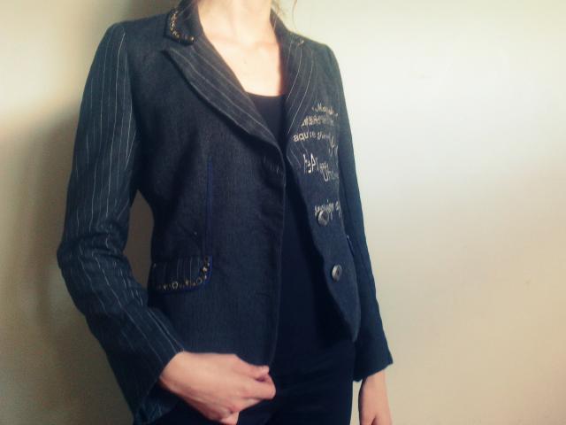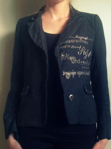 Švarkas yra labai įdomios formos, daug mažyčių aukso detalių, viena rankovė dryžuota, kita su taškiukais, priekis puoštas užrašais. Labai gražus.