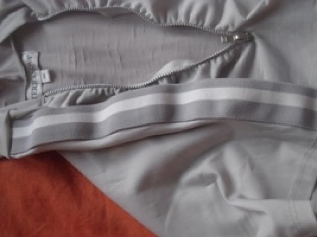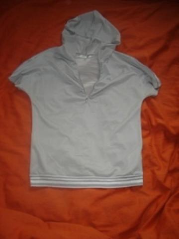 Sidabrinės spalvos, lengvai krintančio šiek tiek permattomo audinio marškinėliai su kapišonu. DYDIS M