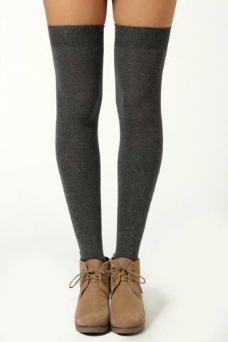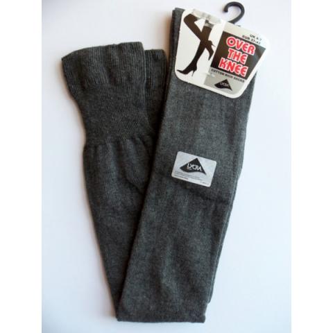 Tamsiai pilkos kojinės virš kelių. Plonesnės - tinkamos mūvėti į batelius. Matinės, nepersimato. Gerai tempiasi, gražiai priglunda ir nesmunka. Turi kulną, kojinių ilgis optimalus - 52 cm nuo kulno, neištempus. Ties blauzda - plati tampri juosta. Sudėtis: 80% medvilnės, 18% poliamido, 2% elastano. Dydis universalus, tinka: UK - 4/7, EU - 37-42 dydžio pėdai. Pagaminta Didžiojoje Britanijoje.