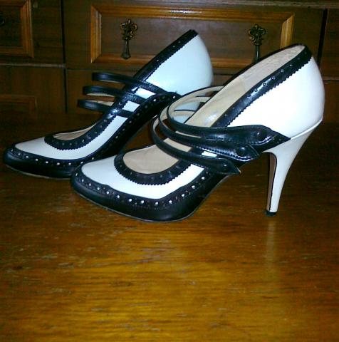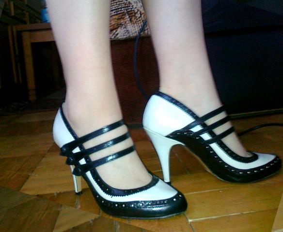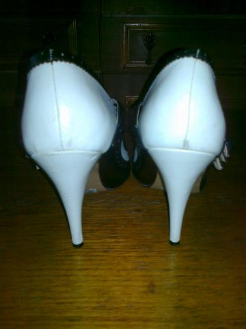 Pin-up baltai juodi bateliai. 39-40 dydžio. Nešioti, bet nenunešioti. Pakulnės keisti nereikia. Vienintelis trūkumas,kad gale vienoj vietoj oda prasitrynus (matosi paskutinėje nuotraukoje).