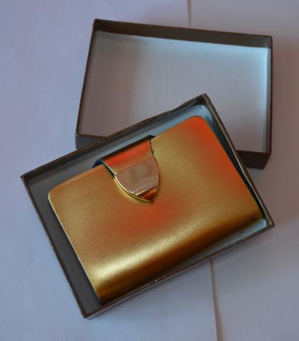Pinigine - vizitinėms, nuolaidų bei mokėjimo kortelėms laikyti! Jei savo piniginėje niekaip nesiseka sutalpinti visų savo kreditinių, vizitinių, nuolaidų kortelių, lūkuriuoti prie kasos desperatiškai ieškant vienos iš daugelio savo nuolaidų kortelių, tai ženklas, kad Jums tikrai reikia naujos, kokybiškos ir talpios piniginės!Tad siūlau įsigyti arba padovanoti aukštos kokybės kortelių piniginę. Pinigine kartu su dezute. Liko tik auksines spalvos. Atsiuntimas 4 lt