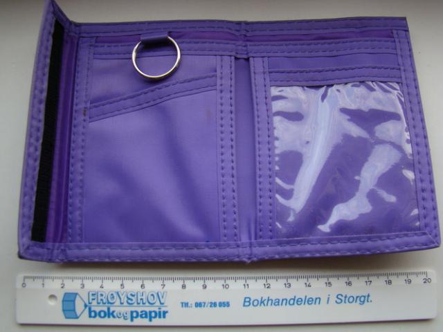violetinė piniginė, kiek pamenu, nenaudota. ;] skyrelis centams, permatoma kišenėlė, kelios paprastos. raktų pakabukas viduje.