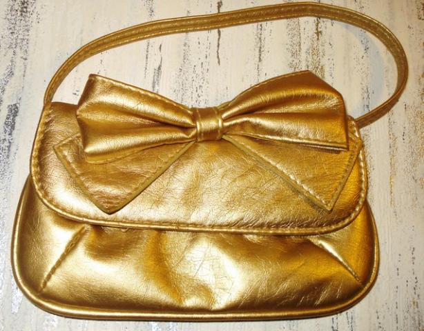 kiek senovine pinigine,auksines spalvos,su kaspinu ir rankenele.