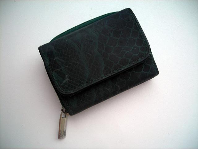 Tamsiai žalsva piniginė. Su gyvatės odos raštu, beveik nauja.