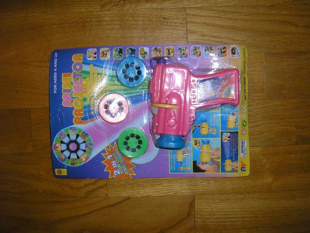 Pistoletas su skaidremis, sviecia tamsoje, galima ziureti kaip filmukus, reikia 2 elementu. Turiu 2 pistoletus rozinius viena supakuota, kita nesupakuota.