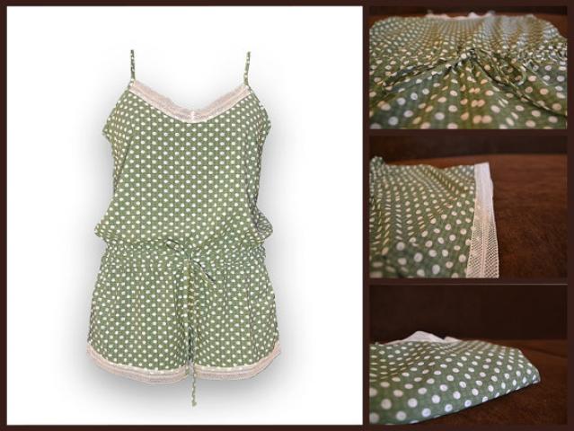 Miego kombinezonas siūtas iš poliesterio. Modelis yra unikalus, sukurtas patyrusios dizainerės - konstruktorės. Kombinezonos puoštas nėriniais. Perkant pridėsime kelionių maišelį kombinezonui dovanų. Krūtinės apimtis 86-90 cm, liemens apimtis 64-68 cm, klubų 92-96 cm.