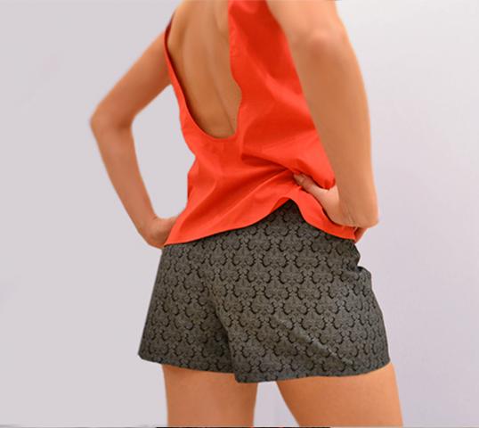 Šortukai miegui siūti iš medvilnės. Audinys juodos spalvos su pilkais raštais, šortukus dar labiau pagyvina raudonas raištelis. Modelis yra unikalus, sukurtas patyrusios dizainerės - konstruktorės. Pridėsime dovanų šortukams skirtą kelionių maišelį. Liemens apimtis 64-68 cm, klubų 92-96 cm.