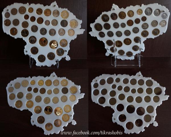 • Baltas plastikas • Apyvartinėms / proginėms 1991-2014 monetoms • Susukamas varžtais • Žemėlapio formos dizainas • Monetos matomos iš abiejų pusių • Matmenys 270 x 210 x 9 mm