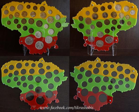 apyvartinės" Trispalvis plastikas Apyvartinėms 1925-2014 monetoms Susukamas varžtais Žemėlapio formos dizainas Monetos matomos iš abiejų pusių Matmenys 270 x 210 x 9 mm