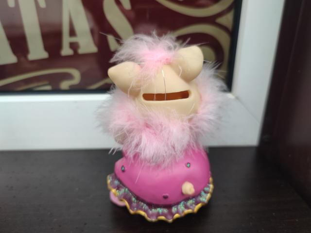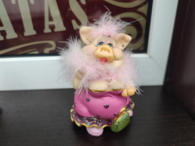 Plastiko liejinio statulėlė- taupyklė pasipuošusi kiaulytė.