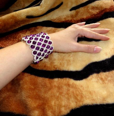 Rankų darbo plati sutažo ir daužto stiklo karoliukų apyrankė su derančiais auskariukais.