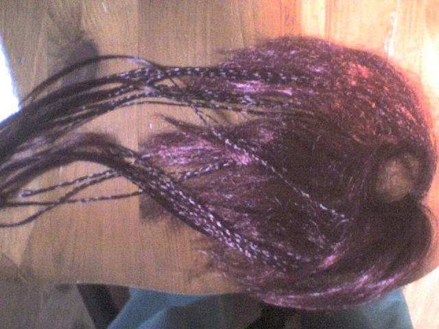 Plauku gumelė-perukas, bordinė ir raudona spalvos. Viršuje paleisti trumpi plaukai, apačioje matosi ilgesni, į smulkias kasytes supinti plaukai.