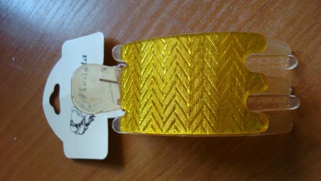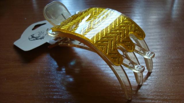 auksinės spalvos, ilgis 9 cm, skersmuo 4 cm. puikiai tiktų ilgiems plaukams arba kuodukui susegti