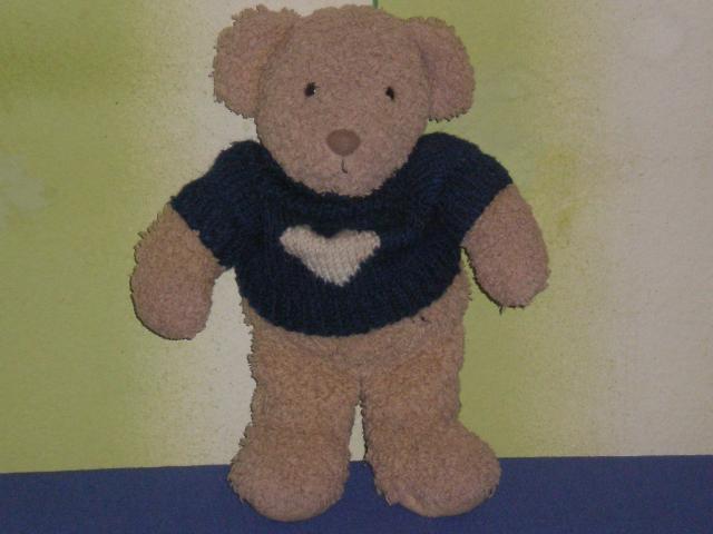 Pliusinis meskinas su melsvu megztiniu ir sirdele