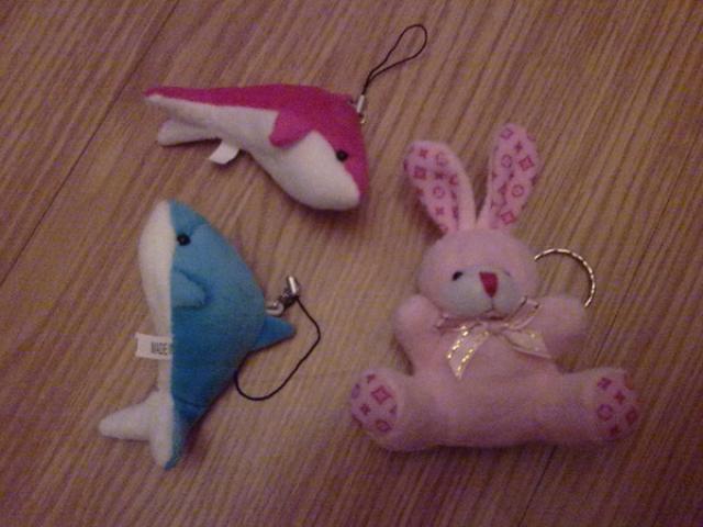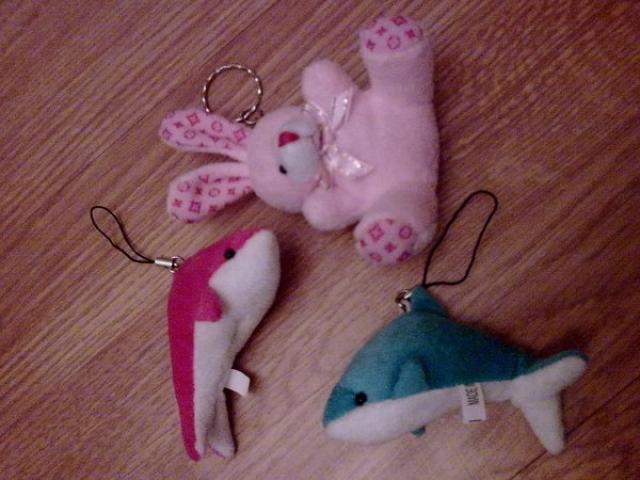 Pliušinių pakabukų komplektas, į kurį įeina 1 zuikutis, ir 2 delfinukai (vienas rožinis, kitas žydras). Visiškai nauji ir nenešioti.