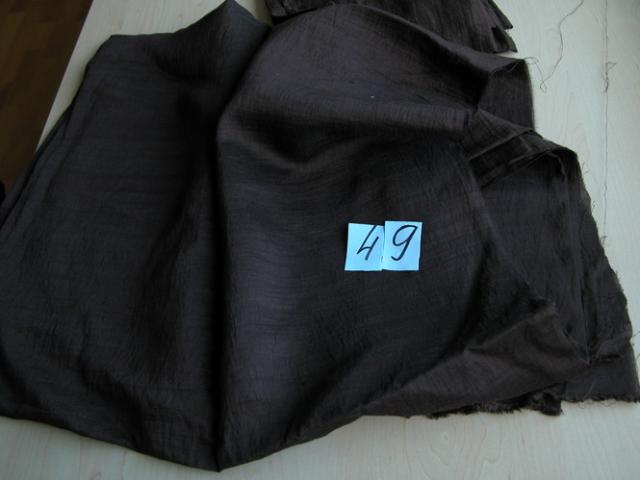 Šokolado sp., truputį paglamžyta, turi žvilgesio, tiktų palaidinei, vasar. kostiumėliui. Plotis 1,54m, ilgis 1,96m, 0,53m, 0,51m. Kt. atspalvio, ne šok., o į samaninę šiek tiek :plotis 1,56m, ilgis 1,27m, 2,6m (kampe iškirptas 1,05*0,35m gabaliukas)