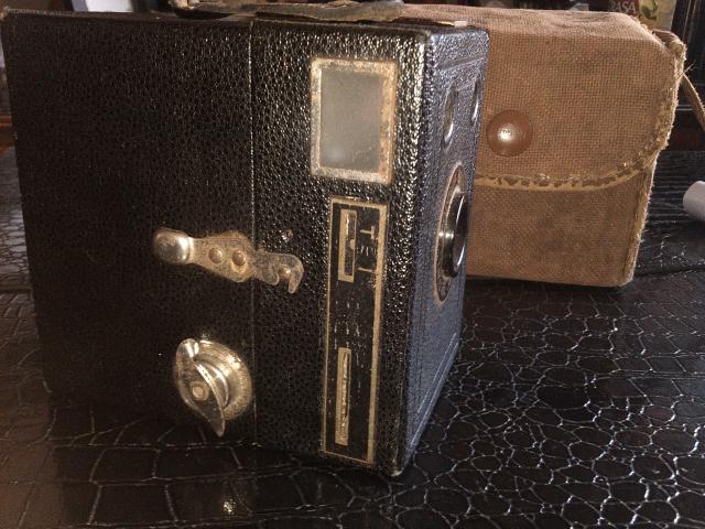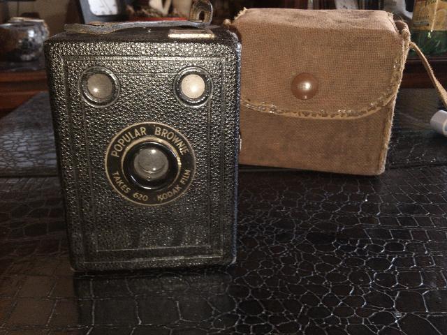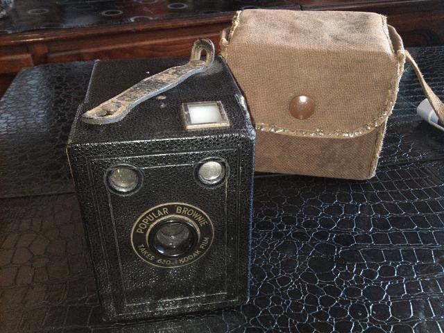 Pakankamai geros buklės Popular Brownie 1940m. fotoaparatas. Manau, kad yra galimybė net ir padaryti fotografijų, nes užraktas veikia. Kartu originalus dėklas. Galima derėtis proto ribose.
