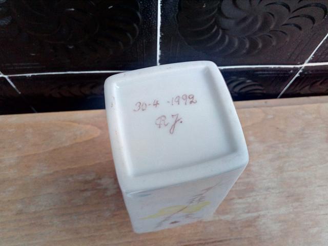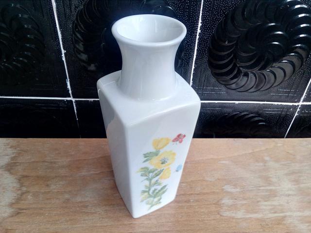 Porcelianinė rankom tapyta vazelė su gėlėm, drugeliais ir boružėle.