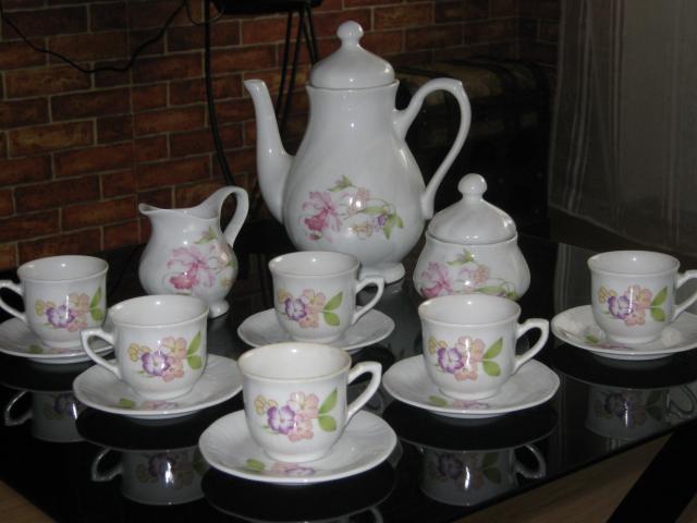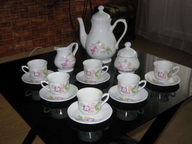 Arbatos servizas is porceliano. Baltos spalvos, puostas gelemis. Serviza sudaro arbatinukas, cukrine, asotelis grietinelei ir 6 puodeliai (nedideli) su lekstutemis. Puodelio aukstis 5,5 cm. Servizas nenaudotas.