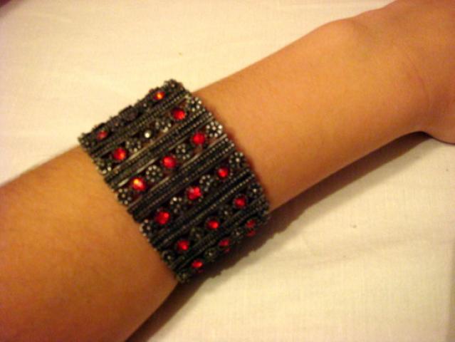 Nauja, elegantiška, puošni metalinė apyrankė su raudonomis žėrinčiomis akutėmi.