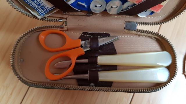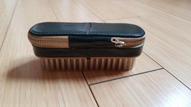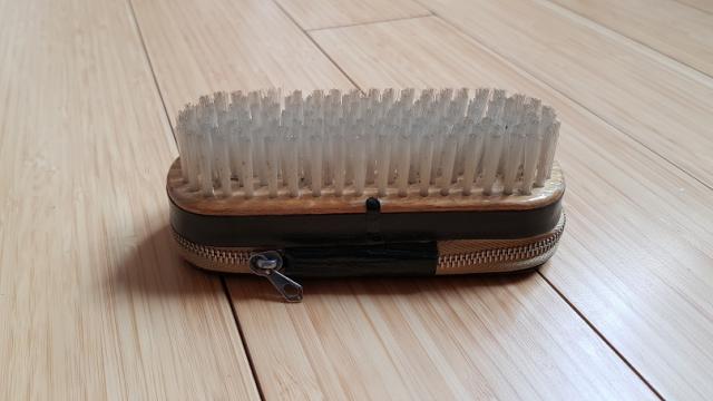 Iš senų laikų likęs kelioninis rinkinukas. Rūbų ar batų šepetys su išorine kišenėle užsegamu dėklu, kuriame telpa būtiniausi kelionės reikmenys - adatos, siūlai, manikūro reikmenys, žirklutės ir kt.. (c)